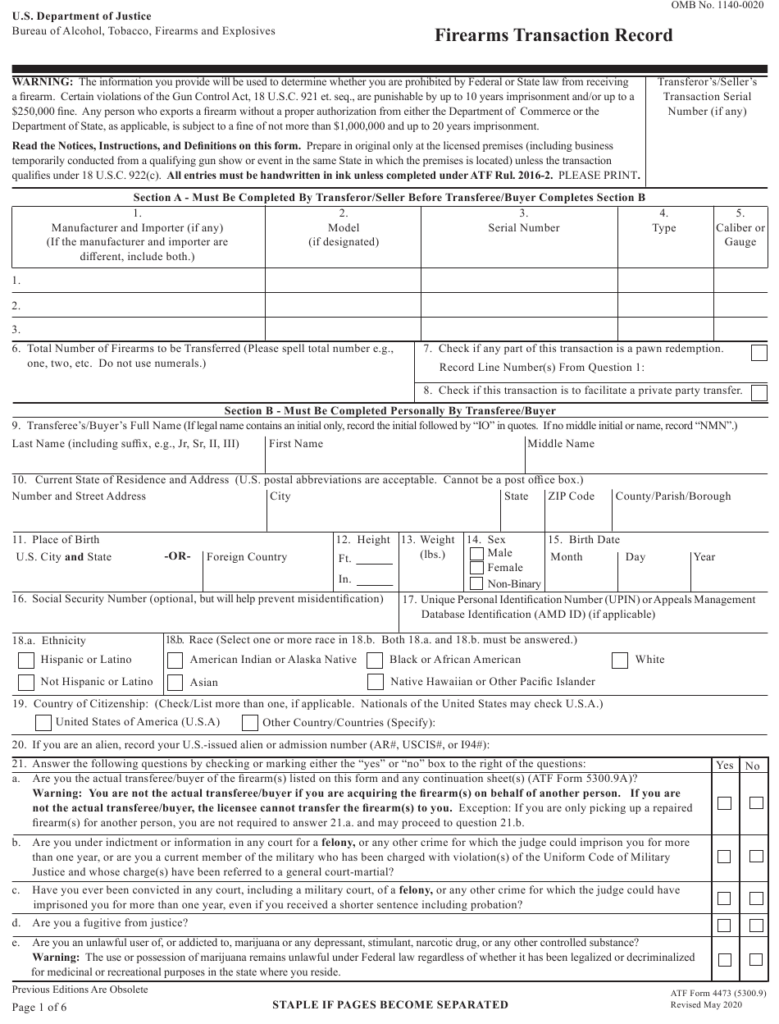 The Printable Form 4473 is an essential document used by firearms dealers in the United States to conduct background checks on individuals purchasing firearms. This form is required by the Bureau of Alcohol, Tobacco, Firearms and Explosives (ATF) and helps ensure that only eligible individuals can legally purchase firearms.