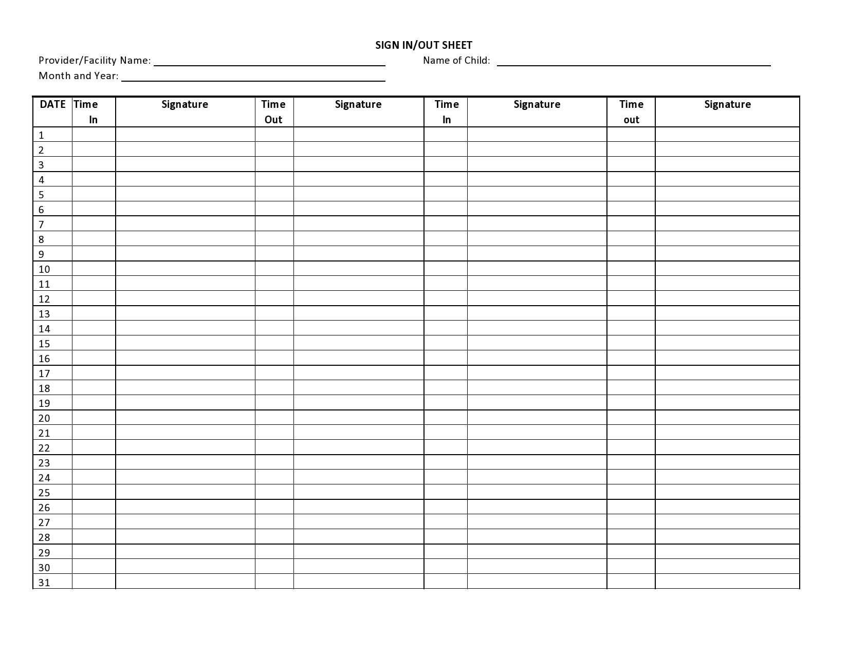 Printable Sign In And Out Sheet