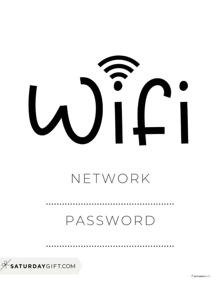 Our free printable wifi password sign allows you to easily display your network name and password for guests to access without having to ask you for it. Simply print out the sign, fill in your wifi details, and place it in a visible location in your home.